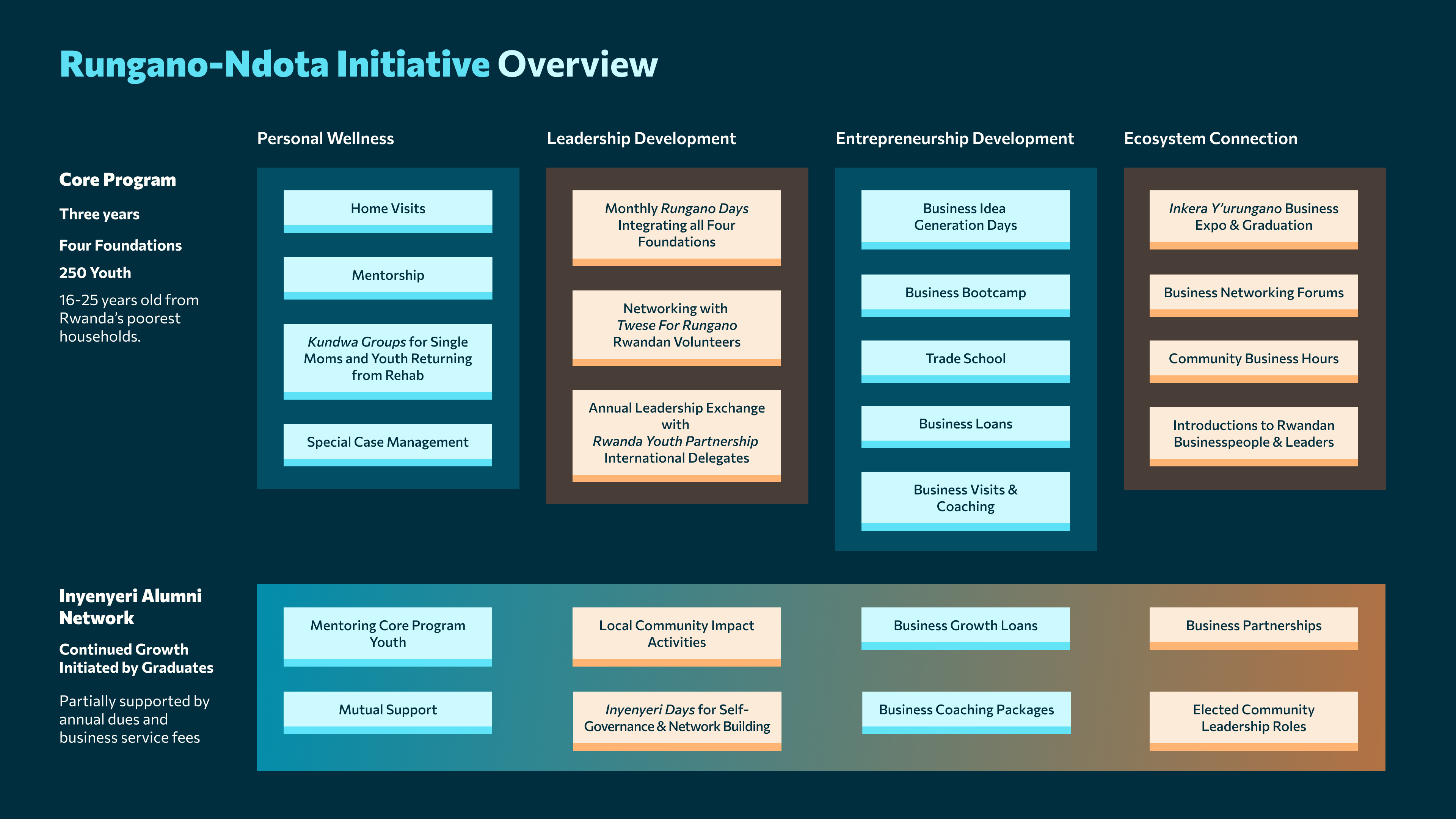 New brand and expanded website to be launched by Inkera Y'Urungano 2026, RNI's annual graduation and business expo event held at the end of February. The project deliverables include a custom CMS-based website, banners, social media kit, impact report, t-shirts, wayfinding, and a brand book.